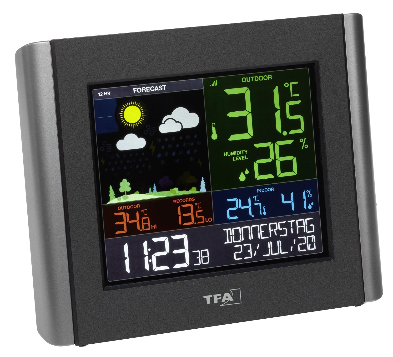 <br /><br />Zusätzlich erscheinen weitere interessante Wetterdetails wie die voraussichtlichen Höchst- und Tiefsttemperaturen und die Regenwahrscheinlichkeit. Zeit und Kalender werden regelmäßig auf den neuesten Stand gebracht und Sie können über die TFA VIEW App sogar persönliche Botschaften oder zusätzliche Wetterinfos programmieren, die auf dem Display der Wetterstation angezeigt werden.