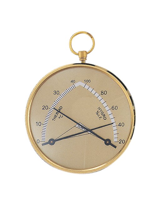 Thermometer und Hygromter, zum Aufhängen geeignet. Kunststoff, goldfarben, Ø 85mm. Hergestellt in Deutschland.