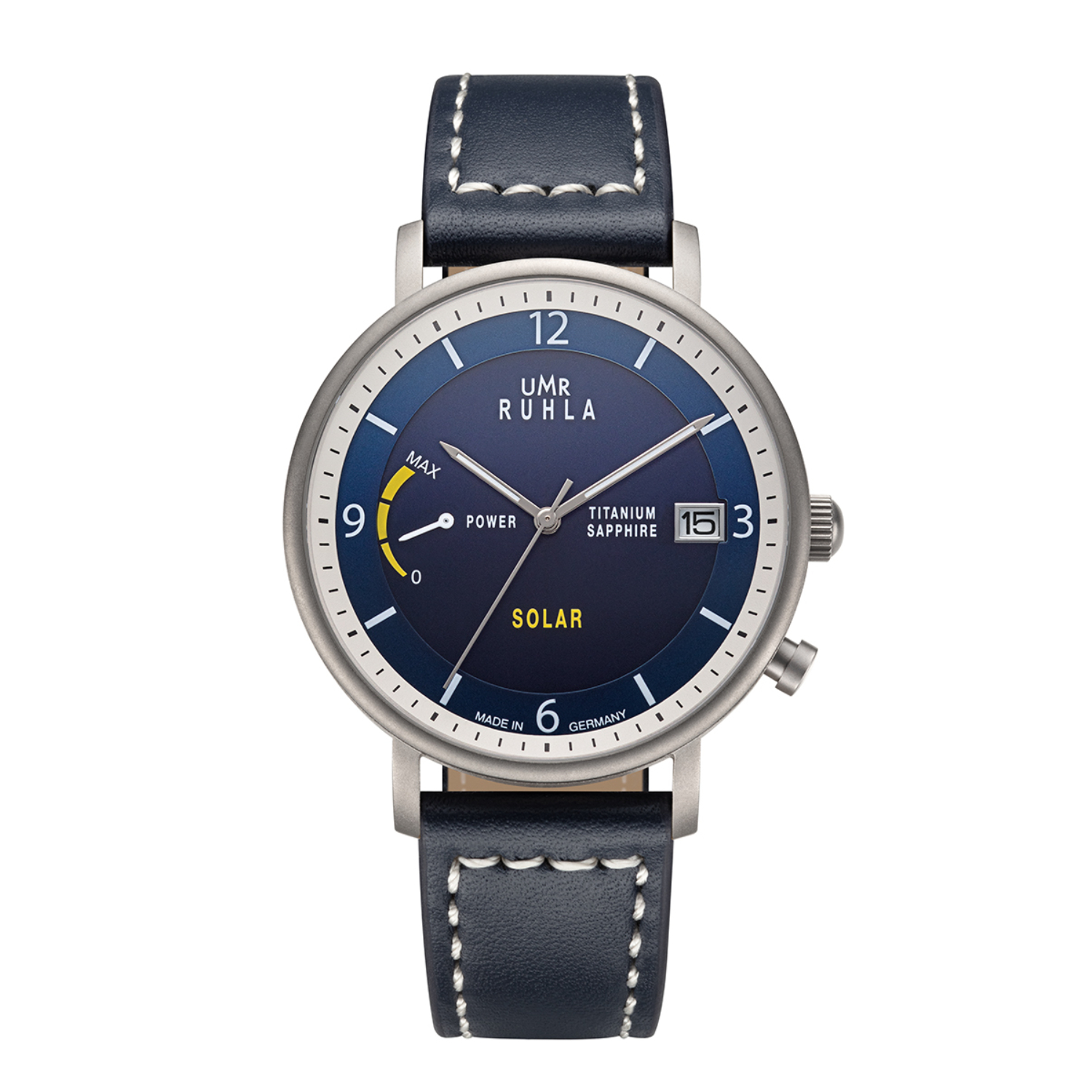 Uhren Manufaktur Ruhla – Armbanduhr Solar Ø 41mm Titan/ Lederband dunkelblau