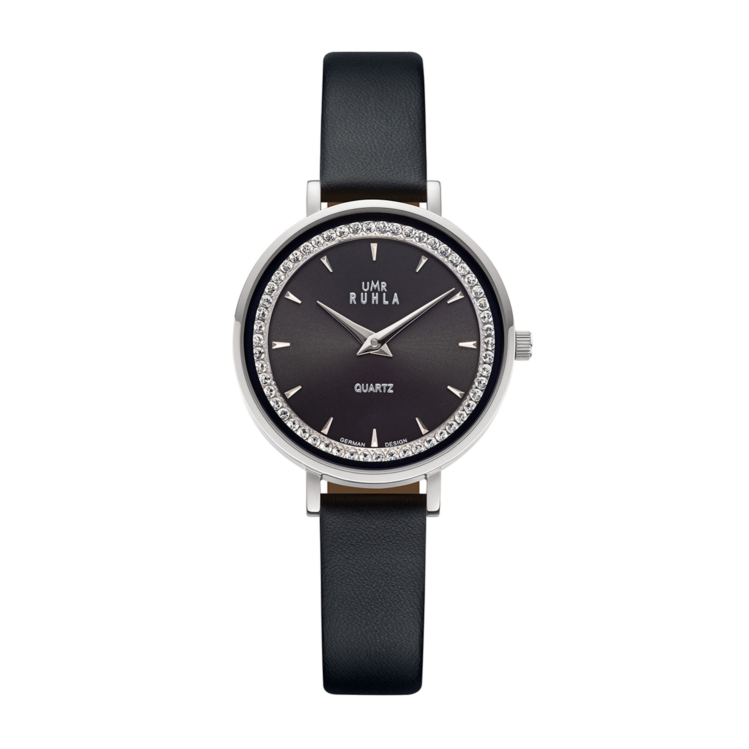 • Uhrwerk Miyota GL22, quarzgesteuert<br />• Edelstahlgehäuse mit Swarovskisteinchen innenliegend, poliert<br />• schwarzes Lederband<br />• schwarzes Zifferblatt mit silbernen Indizes<br />• Mineralglas<br />• wasserdicht bis 5 atm<br />• Durchmesser: 32 mm, Höhe: 7 mm, Gewicht: 26 g