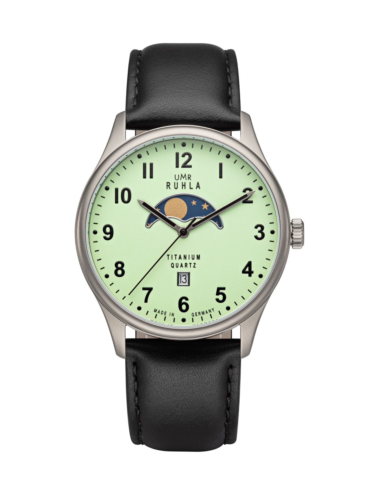 Uhren Manufaktur Ruhla – Mondphase-Uhr – Titan – Leuchtzifferblatt – Lederband – made in Germany