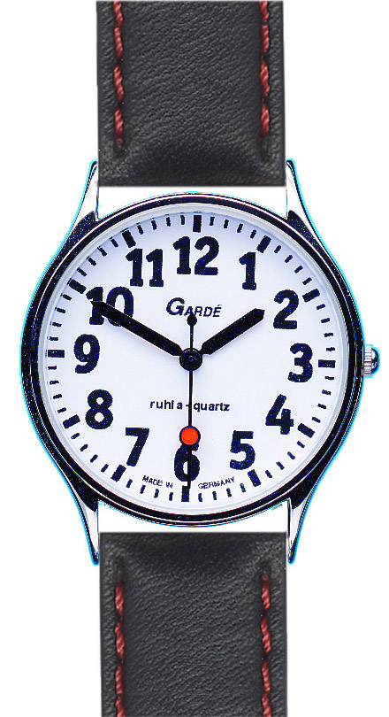 <br />• Versehen ist die Armbanduhr mit einem KONTRASTREICHEN Zifferblatt (schwarze Ziffern auf weißem Grund) sowie mit EXTRA GROSSEN ZIFFERN und ROTER Sekunde.