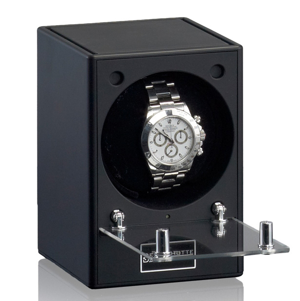 Quadratisch, praktisch, innovativ – der neue Uhrenbeweger aus dem Hause Designhütte überzeugt durch sein gradlinig, elegantes Design, sowie die zum Patent angemeldete Induktionstechnik. Mit nur einem Netzkabel können bis zu vier neben- oder aufeinander gereihte Uhrenbeweger kabellos mit Strom versorgt werden. Dabei kann jedes einzelne Modul unabhängig programmiert werden.
