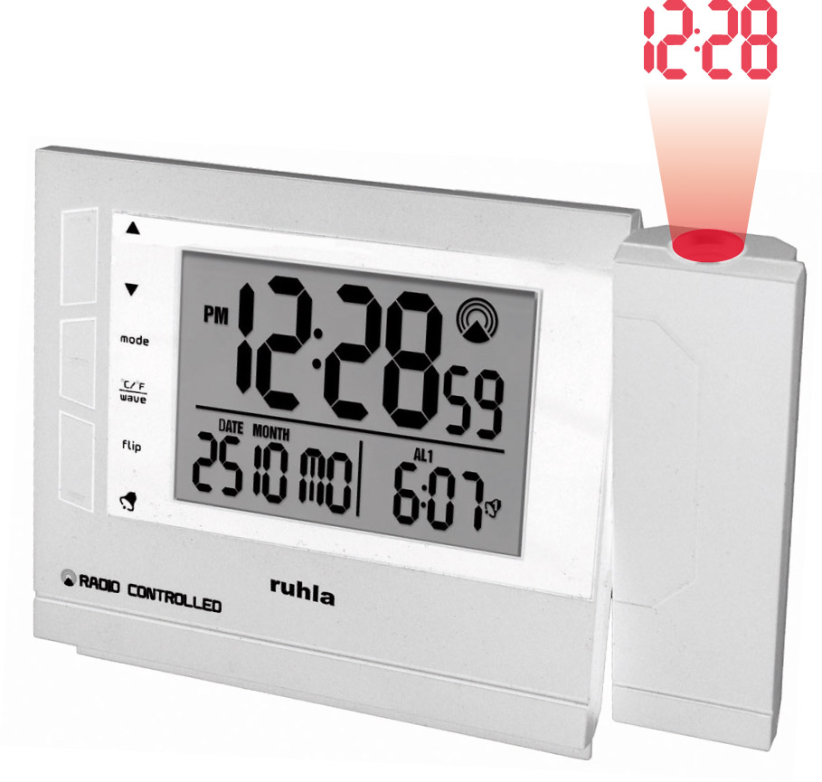 <br /><br />• Funkwecker digital mit Projektion, für Batterie 2x LR 3 (Option Netzteil 3V)
