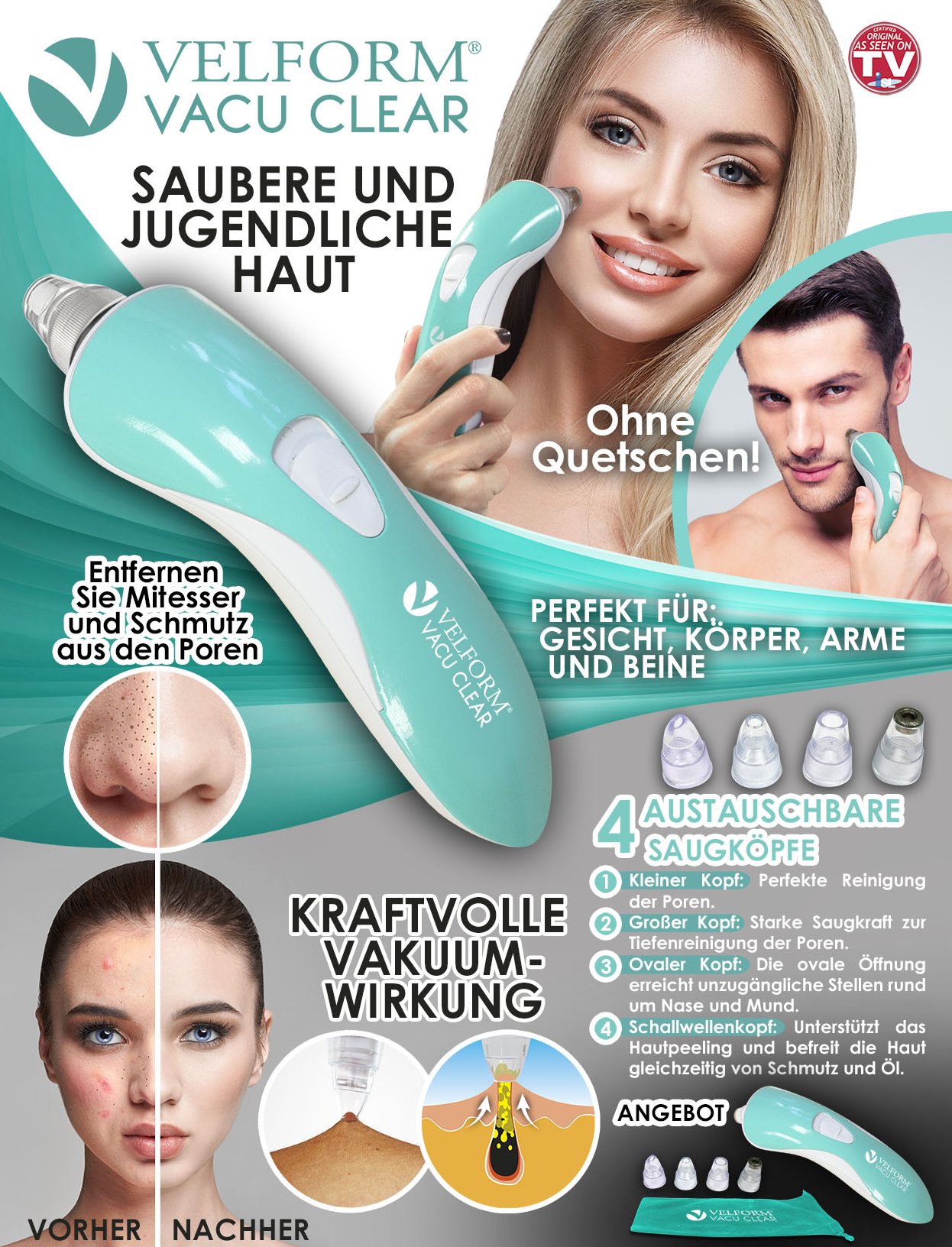 <br /><br />Velform® Vacu Clear ist ein Porenreiniger für saubere und jugendliche Haut mit kraftvoller Vakuum-Wirkung. Mit dem Gerät können Sie Mitesser und Schmutz aus den Poren im Gesicht entfernen, ohne, dass Druck auf diese ausgeübt werden muss. Der kräftige Saugmechanismus entfernt Schmutz und Fett von der Haut.