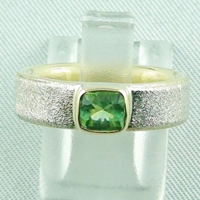 Edelsteinring mit einem grünen Turmalin besetzt aus Sterling Silber und Gold – Hochwertige Designerringe bzw Verlobungsringe von der Opal-Schmiede Massiver Silberring bzw Goldring mit einem grünem Turmalin in einer Goldfassung . Wunderschöner Unikatsring - Designer Turmalingring. Es handelt sich um einen massiven 935er Silber Ring mit 585er Gold. Das Innenband ist aus Gold und das Außenband ist aus Sterling Silber gefertigt. Sie sind auf der suche nach einem außergewöhnlichen Schmuckstück? Dann haben Sie mit unserem Designer Silberring genau das Produkt gefunden, was Sie gesucht haben. Der Ring mit dem Turmalin ist nicht nur schön anzusehen, sondern auch noch ein absolutes Unikat! Der Silberring wird mit einem Echtheitszertifikat ausgeliefert. Der hier verwendete Turmalinring hat einen perfekten     cushion kissen Schliff. Die Farben sind in natura intensiver als auf dem Foto oder im Video.  Ring Details Material: massiv Silber 935 / Gelbgold 585 14k Gewicht: 7,50 Gramm Ring Innendurchmesser: 17,20 mm Ring Innenumfang: 54,00 mm Ring Kopf Breite: 5,88 mm Ring Kopf Länge: 6,40 mm Ring Kopf Höhe: 5,32 mm Ringschienen Breite: 5,77 mm Ringschienen Dicke: 2,11 mm   …
