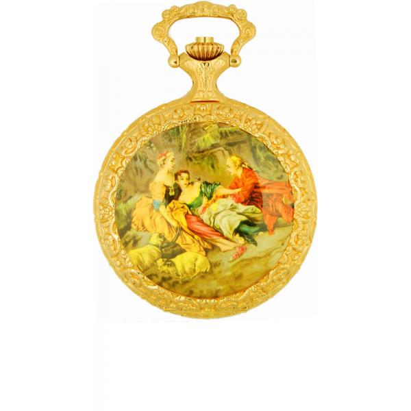 Schweizer Taschenuhren – Mechanisches Handaufzugwerk (Cal. Unitas)- weisses Zifferblatt (mit Sichtfenster)- römische Zahlen (schwarz)- Louis XVI Zeiger (schwarz)- 17 Rubinlagersteine- vergoldete und dekorierte Werkbrücken- Incabloc Stosssicherung- vergoldetes Savonettegehäuse- Frontdeckel mit Gemälde Gruppe von Damen mit Herr- Pressboden mit Blumenmuster- Hesalithglas (bombiert)staubgeschützt (nicht wasserfest!)Ø: 48 mm, h: 12 mm2 Jahre GarantiePreis inkl. Box