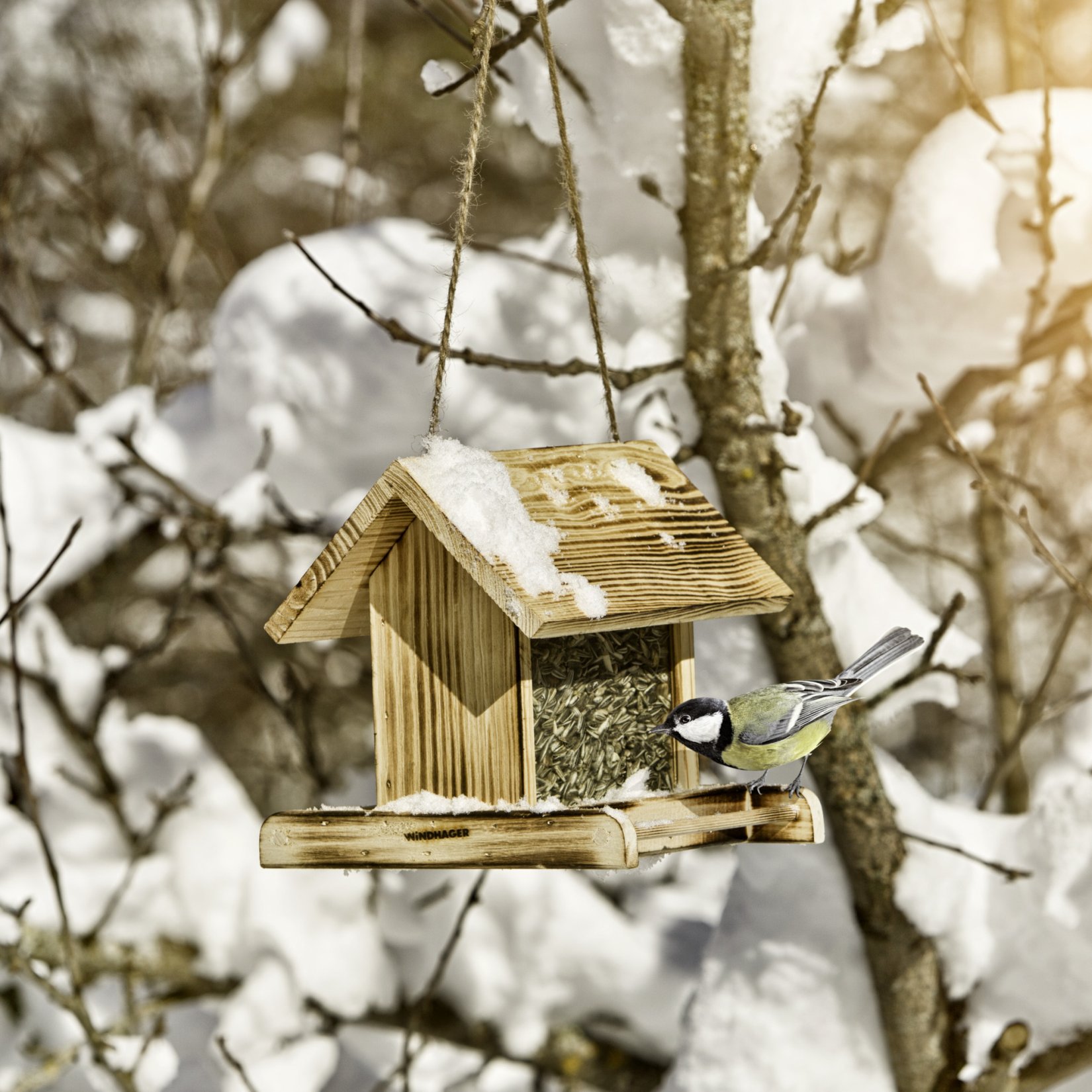 <br /><br />Das Vogelfutterhaus ist aus Massivholz hergestellt, welches gehobelt und geflammt wurde. Auf beiden Seiten befinden sich runde Sitzstangen und Glasfenster zur einfachen Kontrolle des Futterstandes. Befüllung mit geeignetem Vogelfutter (fertige Mischungen, Sonnenblumekerne etc.) durch abnehmbares Dach. Inklusive Aufhängeschnur.