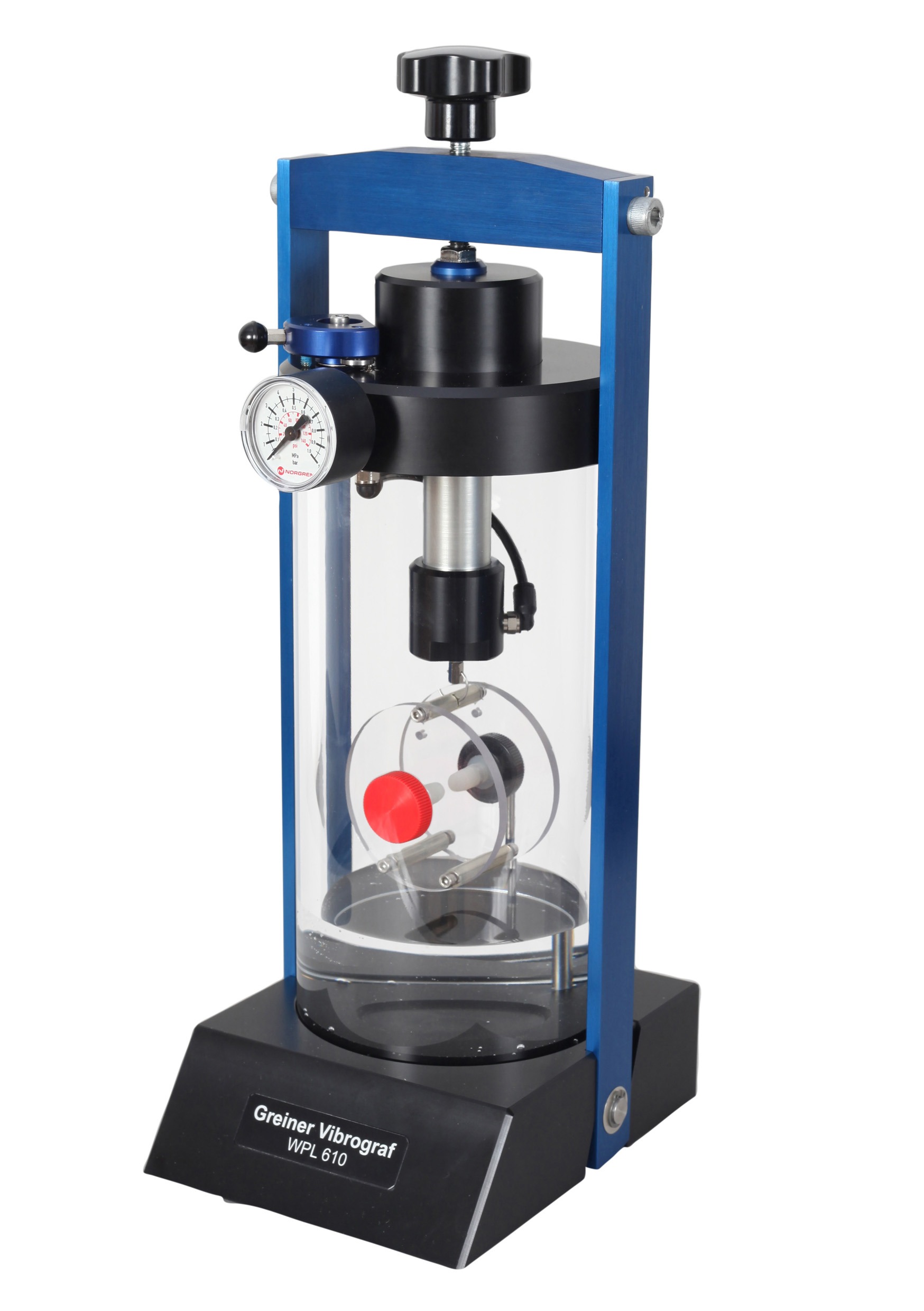 <br />Druckaufbau: mittels einer Fußpumpe (nicht im Lieferumfang) oder Kompressor (Kompressoren finden Sie im Kapitel 9 dieses Kataloges). Ein- und Auftauchen der zu prüfenden Uhr: automatisch. Halter für Uhren nicht im Lieferumfang. Mit dem eingebauten Tasthebel kann die Druckluftzufuhr ein- und ausgeschlatet werden.