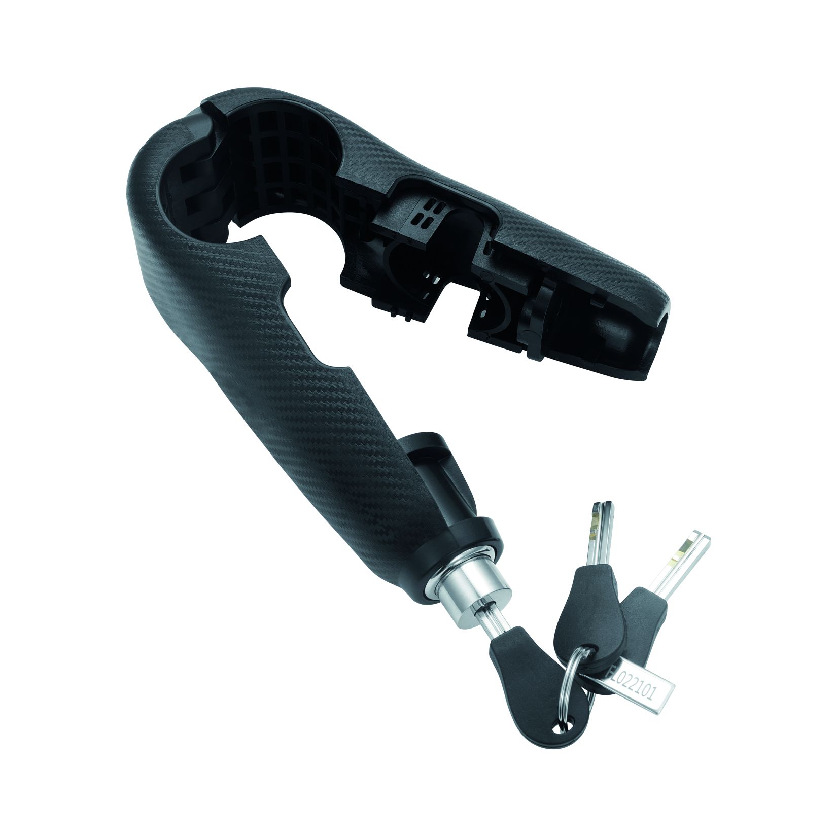 <br /><br />• Schützt gleich doppelt vor Diebstahl: Die größere Öffnung wird um den Handgriff angebracht, in der kleineren Öffnung wir der Bremshebel bzw. der Kupplungshebel arretiert. So ist die Bremse automatisch angezogen bzw. die Kupplung blockiert und das Gefährt ist mechanisch gegen Wegschieben gesichert.