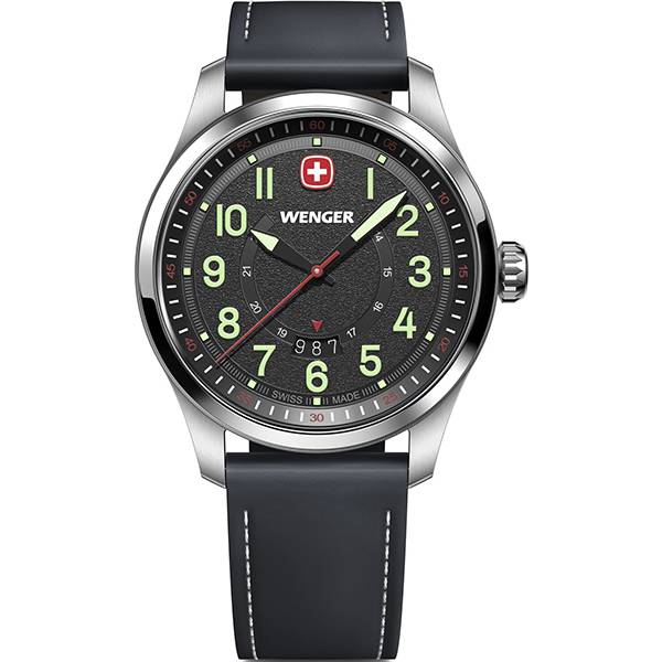 Klarheit ist in einer Welt, in der uns die Zeit häufig davonzulaufen scheint, absolut essenziell. Bei den Wenger Terragraph-Uhren trifft gute Lesbarkeit, selbst bei einem flüchtigen Blick, auf ein zeitloses Design. Diese cleveren Schweizer Uhren meinen es ernst – und machen Ernst. Präzise positionierte Ziffern helfen bei der klaren Übersicht über die Stunden – denn wir wissen, dass die Multitasker von heute sich keine Fehler leisten können. Wenger Terragraph Uhren 01.0541.121 – Schweizer qualitäts Uhrwerk (Cal. Ronda) – präzise Quarz-Technologie – schwarzes Zifferblatt – Leuchtzahlen (grünlich)- aufgedruckte Minuterie – schwarze Leuchtzeiger (Superluminova) – zentraler Sekundenzeiger (ausgewuchtet) – schwarze Datumsanzeige (Position 6 Uhr) – Edelstahlgehäuse (mattschlifft)   polierte Glaslunette – verschraubter, nummerierter Edelstahlboden   mit Wenger Logo – gehärtetes Mineralglas (flach) – schwarzes Rindslederarmband – Edelstahl Dornschliesse – Materialien erfahrungsgemäss antiallergisch 10 ATM wasserdicht (nach DIN) zum Schwimmen geeignet Ø: 43 mm, h: 11 mm, ca. 73g 3 Jahre internationale Garantie Preis inkl. original WENGER Uhrbox, Gebrauchsanweisung Wenger Terragraph Uhren Diese Zeitmesser verströmen Authentizität und machen aus jedem Tag das Beste. Egal, wie sehr der Tagesablauf auch variiert: Die Anforderung an Zuverlässigkeit und Robustheit kann nicht verhandelt werden. Diese Uhren sind mehr Komplize als Accessoire und vermitteln natürliche Eleganz, ohne dabei dem Träger seine einzigartige Persönlichkeit zu nehmen – jeden Tag, das ganze Jahr. Wnger Uhren richten sich an Menschen, die viel unterwegs sind und sich dabei auf eine Schweizer Marke zu einem angemessenen Preis verlassen. Original Wenger Armbanduhren vom Schweizer Uhrmacher Die Swiss Made Armbanduhren stehen für höchste Fertigungsqualität, hervorragende Technik und ein klassisches und zeitloses Design. Für Fans von Schweizer Armbanduhren ist die Marke Wenger genau die richtige Wahl. Neue Uhr mit original Garantie des Herstellers. Portofreie Lieferung oder Abholung in Basel. Die Uhr kann gerne vor einer Kaufentscheidung besichtigt, und auch vor Ort in Basel abgeholt werden. Portofreie Lieferung! ⌚ OFFIZIELLE VERTRETUNG Wir verkaufen seit über 50 Jahren Uhren und sind ein zertifizierter Trusted Shop Als autorisierter Schweizer Fachhändler der Marke WENGER (Victorinox) profitieren Sie auch online von den entscheidenden Vorteilen hinsichtlich der Echtheit, den Garantieleistungen und des Nachverkaufsservice beim Online-Kauf. Bei UHREN-SHOP.ch finden Sie noch mehr Wenger Uhren. Einfach auf das Logo klicken »