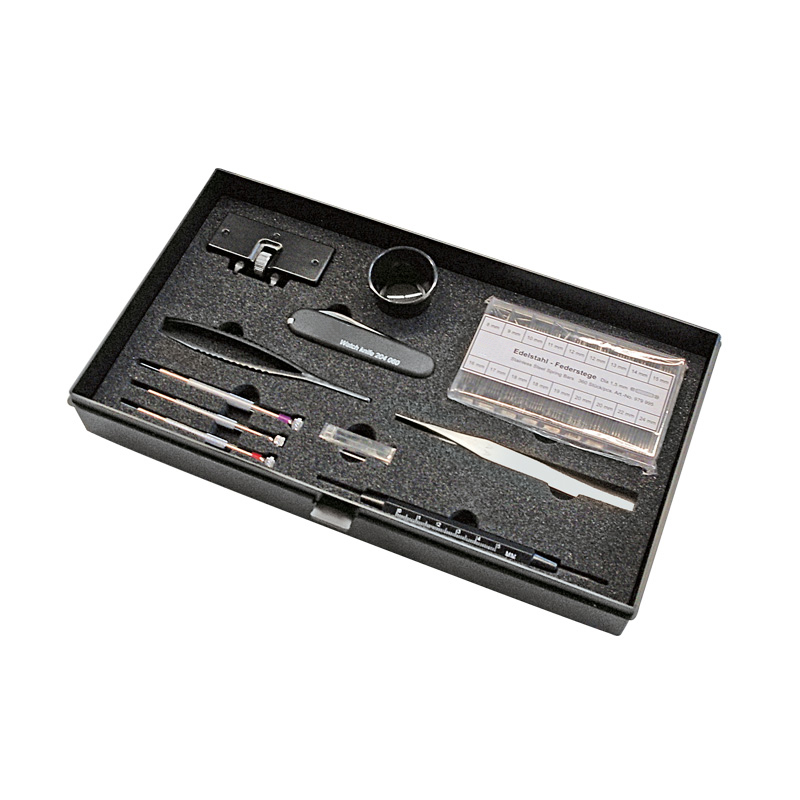 <br />Gehäuseöffner mit weitenverstellbaren Stahlgreifern, Gehäuseöffner-Klinge, Plastikpinzette, Schraubendreher 1, 1,2 und 1,6 mm mit Ersatzklingen, Federsteg-Sortiment 8-24 mm, Feinpinzette AA, Federstegbesteck, Lupe: 2,5-fach