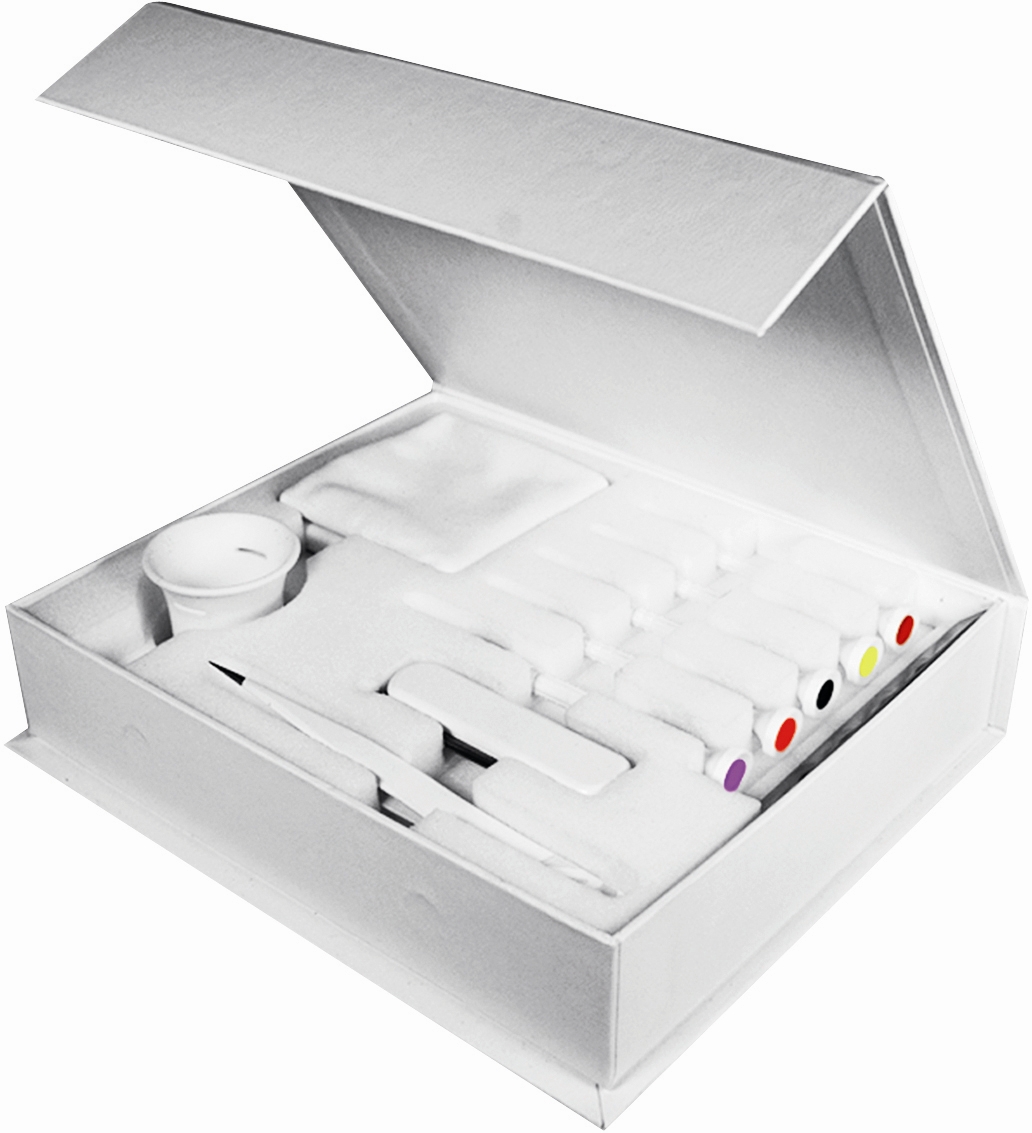 Hochwertige Box in weiß mit weißer Schaumstoffeinlage und weißen Werkzeugen.