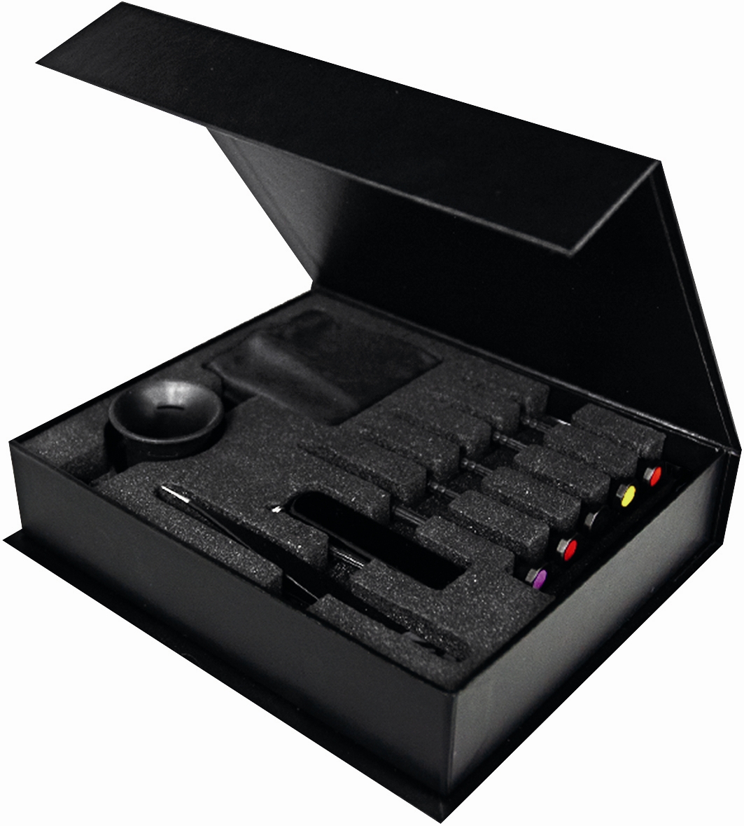 Hochwertige Box in schwarz mit schwarzer Schaumstoffeinlage und weißen Werkzeugen.