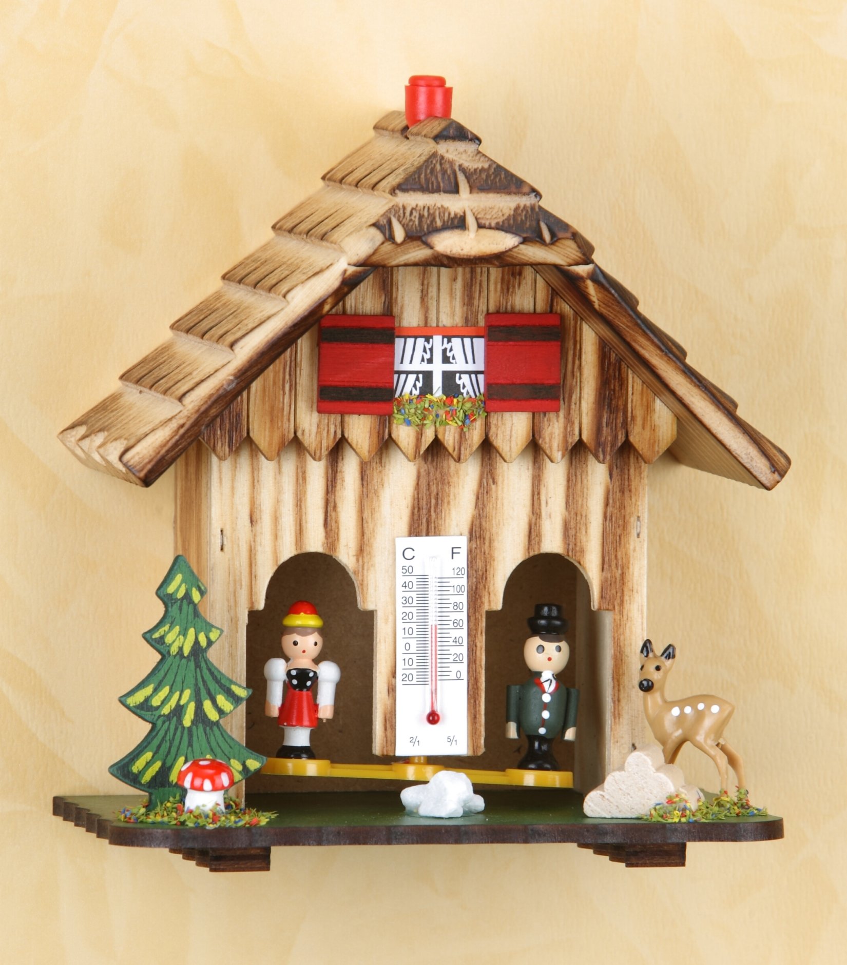 Das niedliche Wetterhaus zeigt durch seine Figuren das Wetter an: