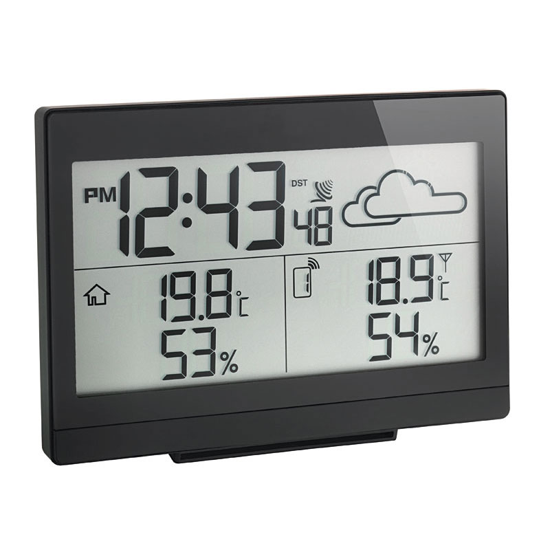 <br /><br />Die Wetterstation mit einem schwarzen Kunststoffgehäuse mit integriertem Sockel misst Temperatur und Luftfeuchtigkeit für Innen und Außen (kabellos bis 50 m Freifeld, erweiterbar auf 3 Sender).