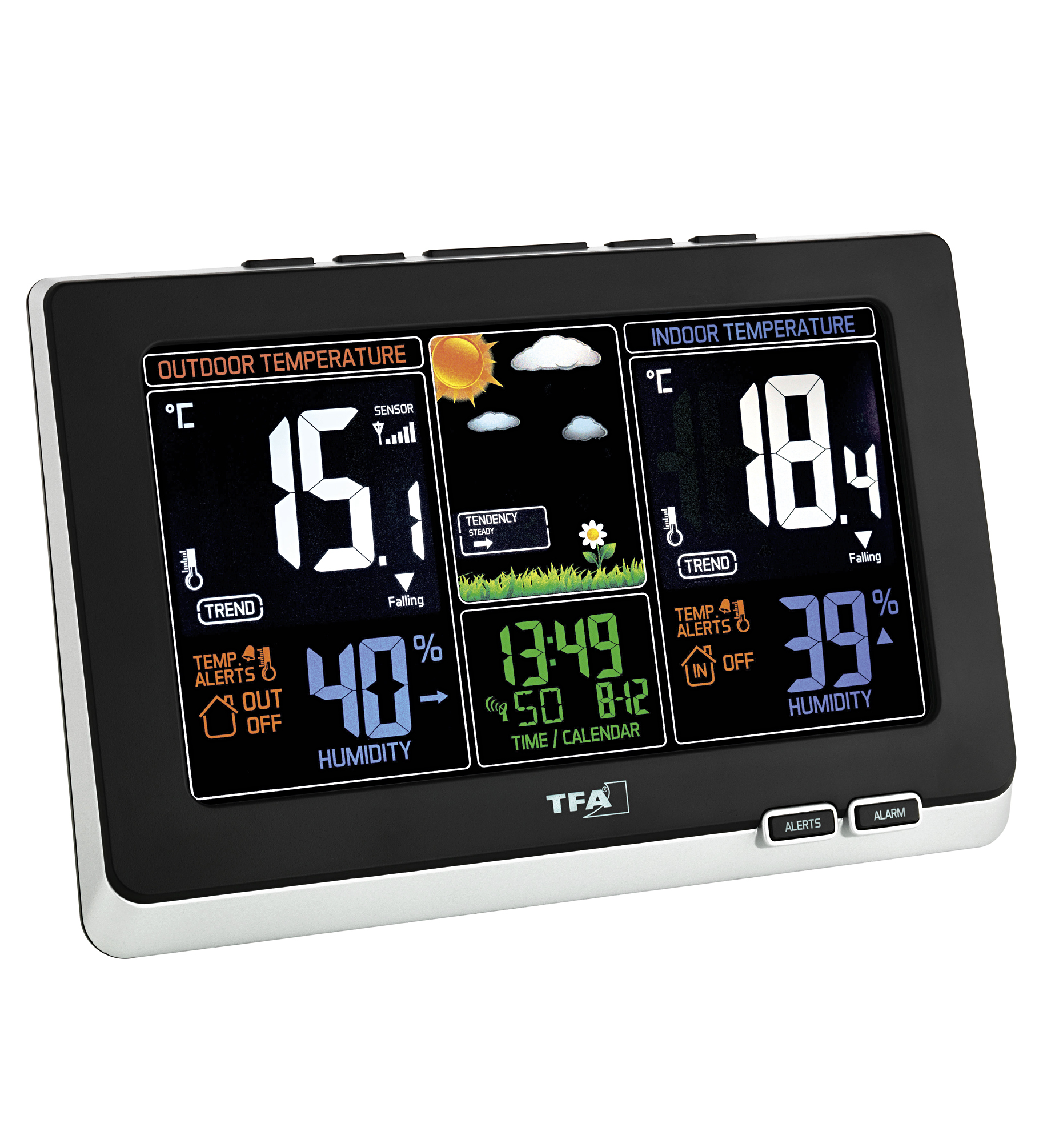 – Anzeige von Außentemperatur (-40 bis +60°C) und Luftfeuchtigkeit über kabellosen Außensender (433 MHz) mit Reichweite bis 60 m (Freifeld).