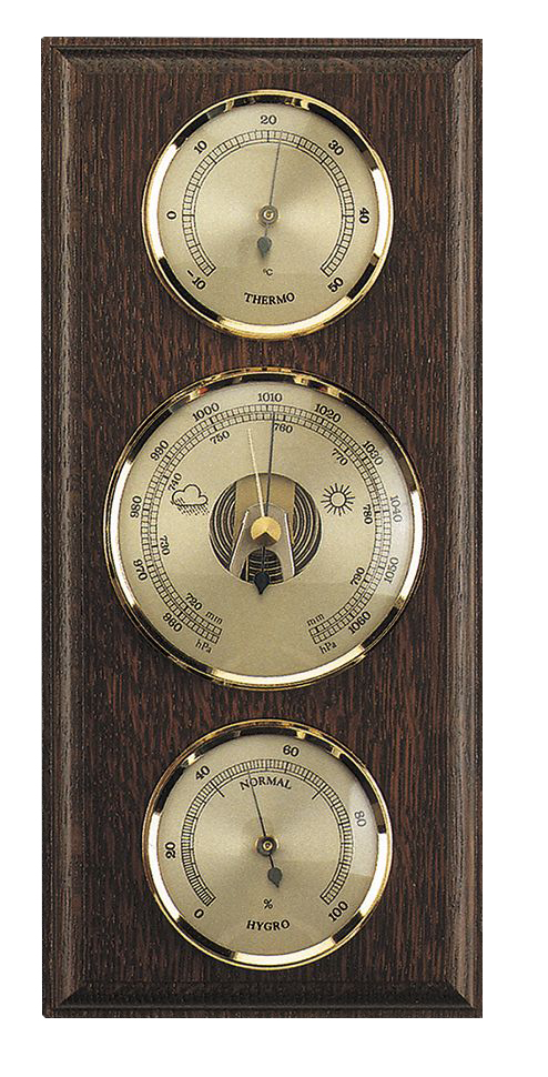 Wetterstation mit Barometer (offen), Thermometer und Hygrometer (Bi-Metall), hergestellt aus massiver Eiche (dunkel) und Messingringen in Unterfranken.