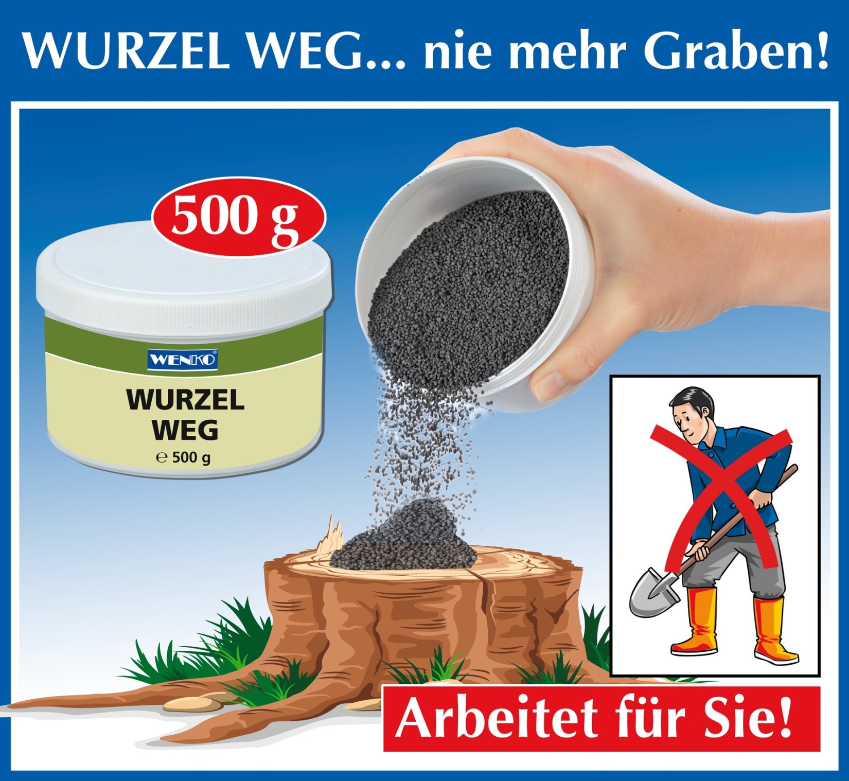 Kein lästiges Graben mehr! Das Entfernen von Baumstümpfen gerät schnell zur schweißtreibenden und zeitraubenden Arbeit, da das Wurzelwerk von Bäumen oft bis tief in die Erde reicht. Mit dem Wurzel-weg ersparen Sie sich diese Mühe und beseitigen Stolperfallen auf einfache und bequeme Weise. Das hochwirksame Wurzel-weg-Granulat beschleunigt den Zersetzungsprozess des Holzes und macht für Sie die Arbeit! Einfach einige Löcher in den Stumpf bohren und das Granulat einfüllen. Bereits nach wenigen Monaten kann sich der Stumpf zersetzt haben (abhängig von Holzart, Umfang und Tiefe). Unschädlich für das Erdreich, das Granulat wirkt im Boden wie ein Dünger.