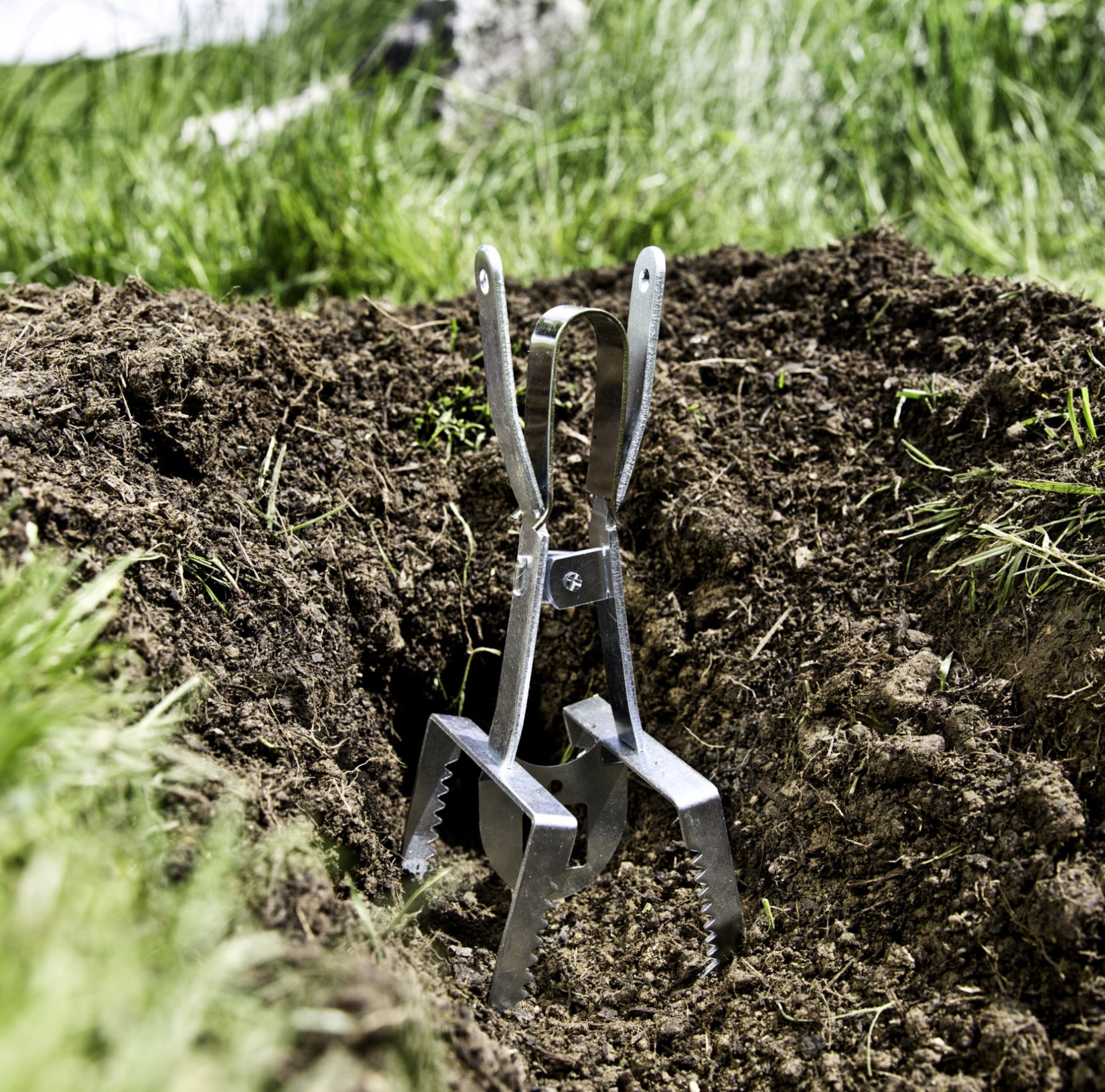 <br />Verschließen Sie alle Löcher und machen Sie circa 3 Stunden später einen Rundgang. Jene Löcher, die nun wieder geöffnet sind, liegen in einem der Hauptgänge, die bis zu einem Kilometer lang sein können. Lösen Sie die obere Grasnarbe beim Gang. Spannen Sie die Falle wie in den Illustrationen gezeigt und platzieren Sie diese in rd. 10 cm Tiefe. Nun decken Sie die soeben freigelegte Öffnung mit umgedrehter Grasnarbe oder einem Eimer ab. Markieren Sie die Stelle mit einem Stab und kontrollieren Sie diese in ein paar Stunden. Mit etwas Glück ist Ihnen bereits eine Wühlmaus in die Falle gegangen.