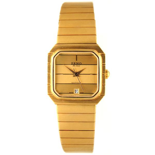 Zeno Damenuhren mit Saphirglas Schweizer Quartzwerk, Zifferblatt (vergoldet) im gleicher Struktur wie Band und Gehäuse, vergoldete Zeiger (h/m), Datumsanzeige (6h).Vergoldetes Messinggehäuse (matt), kratzgeschütztes Saphirglas (flach), vergoldete Krone, Edelstahlarmband vergoldet (matt) mit Faltschliesse.Saphirglas:König unter den Uhrgläsern. Das hochwertigste Glas für Uhrengläser. Die Härte (2100 Vickers) und Kratzfestigkeit wird lediglich vom Diamanten übertroffen.wassergeschützt(nicht zum Schwimmen geeignet)Ø: 25 mm, h: 5 mm2 Jahre Garantie Uhren aus Basel ZENO-WATCH BASEL ist eine traditionsreiche, Familiengeführte Uhrenfabrikation, die 1868 von Jules Godat gegründet und seit 1922 unter dem Markennamen Zeno Uhren produziert. Anfangs auf die Produktion von Eisenbahner Taschenuhren spezialisiert, fertigte man schon in den 1930er Jahren Armbanduhren für Piloten. In den 60er Jahren konstruierte Zeno die unter Vakuum abgedichteten Compressor Uhren und erweiterte die Fliegeruhren Kollektion, für die ZENO-WATCH BASEL auch heute noch bekannt ist. Die Kollektion bietet aber auch noch diverse andere Zeitmessinstrumente wie die Airplane oder Army Diver Taucheruhren, die Bauhaus Design Uhren, die Gentlemen oder die zeitlos schönen Magellano Uhren… Im Inneren der Uhren findet man jegliche Arten von Schweizer Uhrwerken: Mechanische mit automatischem Aufzug (Automatik) oder Batterie betriebene Quarzwerke. Viele mechanische Uhren sind mit einem Glasboden ausgestattet, damit man das Uhrwerk während seiner Arbeit betrachten kann. Zeno ist bekannt für ganz grosse Uhren bis 55mm fertigt aber Modelle in allen Grössen. Viele Versionen werden nur in kleinen Serien hergestellt und regelmässig Sondereditionen für Uhrensammler mit alten und seltenen Uhrwerken. Wir führen Uhren von Zeno-Watch Basel schon seit 50 Jahren und sind nach wie vor von der Qualität und dem guten Preis-Leistungsverhältnis überzeugt. Schweizer Damenuhr Ungetragene Armbanduhr mit Garantie vom Schweizer Uhrmacher. Die Uhr kann gerne vor einer Kaufentscheidung besichtigt, und auch vor Ort abgeholt werden. Portofreie Lieferung Wir sind offizielle Konzessionäre. Sie können alle Modelle auch telefonisch bestellen. Gerne machen wir Ihnen ein Angebot! ⌚ OFFIZIELLE MARKEN VERTRETUNG Wir verkaufen seit über 50 Jahren Uhren und sind ein zertifizierter Trusted Shop Als autorisierter Schweizer Fachhändler der Marke ZENO-WATCH BASEL profitieren Sie auch online von den entscheidenden Vorteilen hinsichtlich der Echtheit, den Garantieleistungen und des Nachverkaufsservice beim Online-Kauf. Wir führen in unserem Uhren Fachgeschäft in Basel noch viele weitere Schweizer Quartzuhren an Lager. Auch bei UHREN-SHOP.ch finden Sie noch mehr Zeno Armbanduhren. Einfach auf das Logo klicken »