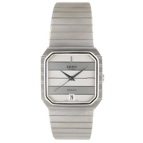 Zeno Armbanduhren mit Saphirglas Schweizer Quartzwerk, Zifferblatt (silber) im gleicher Struktur wie Band und Gehäuse,  Zeiger in silber(h/m, s), Datumsanzeige (6h).Edelstahlgehäuse (matt), Lunette (glanz) kratzgeschütztes Saphirglas (flach), Edelstahlarmband (matt) mit FaltschliesseSaphirglas:König unter den Uhrgläsern. Das hochwertigste Glas für Uhrengläser. Die Härte (2100 Vickers) und Kratzfestigkeit wird lediglich vom Diamanten übertroffenwassergeschützt(nicht zum Schwimmen geeignet)29 x 29 mm, h: 6 mm2 Jahre Garantie Uhren aus Basel ZENO-WATCH BASEL ist eine traditionsreiche, Familiengeführte Uhrenfabrikation, die 1868 von Jules Godat gegründet und seit 1922 unter dem Markennamen Zeno Uhren produziert. Anfangs auf die Produktion von Eisenbahner Taschenuhren spezialisiert, fertigte man schon in den 1930er Jahren Armbanduhren für Piloten. In den 60er Jahren konstruierte Zeno die unter Vakuum abgedichteten Compressor Uhren und erweiterte die Fliegeruhren Kollektion, für die ZENO-WATCH BASEL auch heute noch bekannt ist. Die Kollektion bietet aber auch noch diverse andere Zeitmessinstrumente wie die Airplane oder Army Diver Taucheruhren, die Bauhaus Design Uhren, die Gentlemen oder die zeitlos schönen Magellano Uhren… Im Inneren der Uhren findet man jegliche Arten von Schweizer Uhrwerken: Mechanische mit automatischem Aufzug (Automatik) oder Batterie betriebene Quarzwerke. Viele mechanische Uhren sind mit einem Glasboden ausgestattet, damit man das Uhrwerk während seiner Arbeit betrachten kann. Zeno ist bekannt für ganz grosse Uhren bis 55mm fertigt aber Modelle in allen Grössen. Viele Versionen werden nur in kleinen Serien hergestellt und regelmässig Sondereditionen für Uhrensammler mit alten und seltenen Uhrwerken. Wir führen Uhren von Zeno-Watch Basel schon seit 50 Jahren und sind nach wie vor von der Qualität und dem guten Preis-Leistungsverhältnis überzeugt. Schweizer Damenuhr Ungetragene Armbanduhr mit Garantie vom Schweizer Uhrmacher. Die Uhr kann gerne vor einer Kaufentscheidung besichtigt, und auch vor Ort abgeholt werden. Portofreie Lieferung Wir sind offizielle Konzessionäre. Sie können alle Modelle auch telefonisch bestellen. Gerne machen wir Ihnen ein Angebot! ⌚ OFFIZIELLE MARKEN VERTRETUNG Wir verkaufen seit über 50 Jahren Uhren und sind ein zertifizierter Trusted Shop Als autorisierter Schweizer Fachhändler der Marke ZENO-WATCH BASEL profitieren Sie auch online von den entscheidenden Vorteilen hinsichtlich der Echtheit, den Garantieleistungen und des Nachverkaufsservice beim Online-Kauf. Wir führen in unserem Uhren Fachgeschäft in Basel noch viele weitere Schweizer Quartzuhren an Lager. Auch bei UHREN-SHOP.ch finden Sie noch mehr Zeno Armbanduhren. Einfach auf das Logo klicken »