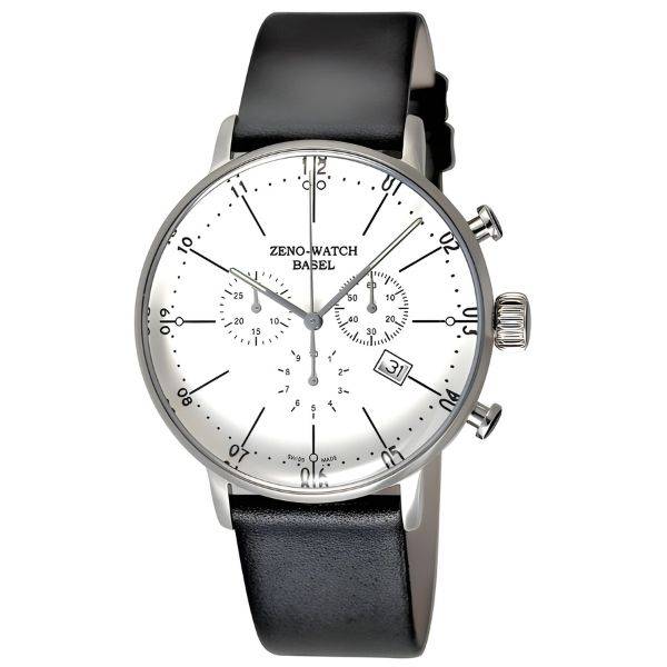 Das graphitschwarz Armband aus glattem italienischen Leder präsentiert sich wunderschön zu dem poliertem Uhren Gehäuse. In Kombination mit dem silberfarbenen Edelstahl Gehäuse ergibt sich ein besonders charakteristischer Look, während sich das Band am weissen Zifferblatt klassisch und elegant zeigt. Design Quartz Chronograph – Schweizer qualitäts Quartzwerk (⬈ Ronda 5030) – Stoppuhr (10/s,sek,min)   (ADD und SPLIT Funktionen) – weisse Datumsanzeige (4h) – weisses Zifferblatt – fein aufgefruckte Minuterie (schwarz) – silberne Baguettezeiger mit Superluminova Leuchtmasse – kleine Sekunde bei 3h – 13 Rubinlagersteine – poliertes Edelstahlgehäuse (316L) – verschraubter Edelstahlboden – Krone mit Doppel-O-Dichtungen – kratzgeschütztes Mineralglas (bombiert) – neutrales Kalbslederband (schwarz) – polierte Edelstahl Dornschiesse 5 ATM wasserdicht (nach DIN) nicht zum Schwimmen geeignet! kurzfristiger Wasserkontakt ist problemlos Ø: 42 mm, h: 11 mm 2 Jahre Garantie Preis inkl. original Etuie, Gebrauchsanweisung, Produkteinfo Das moderne präzisions Startech Uhrwerk mit vergoldeten Werkplatinen und 13 Rubinlagersteinen, wurde von der 1946 in Lausen (BL) gegründetes Firma Ronda produziert. Einer der führenden Hersteller von Quartz Uhrwerken der Welt. Bauhaus Chronograph Das Staatliche Bauhaus wurde 1919 von Walter Gropius in Weimar als Kunstschule gegründet. Nach Art und Konzeption war es damals etwas völlig Neues, da das Bauhaus eine Zusammenführung von Kunst und Handwerk darstellte. Das historische Bauhaus stellt heute die einflussreichste Bildungsstätte im Bereich der Architektur, der Kunst und des Designs im 20. Jahrhundert dar. Das Bauhaus bestand von 1919 bis 1933 und gilt heute weltweit als Heimstätte der Avantgarde der Klassischen Moderne auf allen Gebieten der freien und angewandten Kunst und Architektur. Die Resonanz des Bauhauses hält bis heute an und prägt wesentlich das Bild modernistischer Strömungen, Bekannte Bauhaus Schweizer Architekten/Künstler waren u.a. Johannes Itten, Paul Klee, Le Corbusier, Max Bill, Hannes Meyer… Quelle: Wikipedia Original Armbanduhren von ZENO-WATCH BASEL mit Garantie vom autorisierten Schweizer Fachhändler Neue Uhr mit Garantie des Herstellers. Portofreie Lieferung oder Abholung in Basel. Die Uhr kann gerne vor einer Kaufentscheidung besichtigt, und auch vor Ort in Basel abgeholt werden. Portofreie Lieferung! Wir sind offizielle Konzessionäre. Sie können alle Modelle auch telefonisch bestellen. Gerne machen wir Ihnen ein Angebot! ⌚ OFFIZIELLE MARKEN VERTRETUNG Wir verkaufen seit über 50 Jahren Uhren und sind ein zertifizierter Trusted Shop Als autorisierter Schweizer Fachhändler der Marke ZENO-WATCH BASEL profitieren Sie auch online von den entscheidenden Vorteilen hinsichtlich der Echtheit, den Garantieleistungen und des Nachverkaufsservice beim Online-Kauf. Wir führen in unserem Uhren Fachgeschäft in Basel noch viele weitere Designeruhren an Lager. Auch bei UHREN-SHOP.ch finden Sie noch mehr Zeno Modelle. Einfach auf das Logo klicken »
