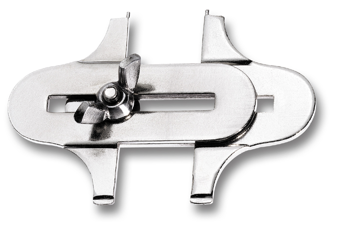 Eine Schlüsselseite mit Schraubendreherschneide, die andere mit Zapfen (Ø 1,2 mm). Abstand verstellbar von 2-20 mm. Zum Lösen und Befestigen von Zentralmuttern bei Quarzwerken.
