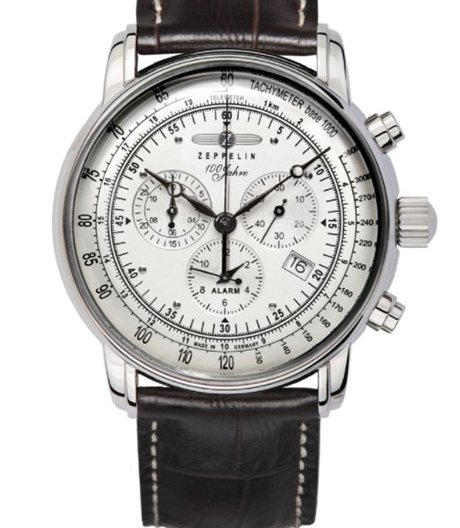 <br /><br />In klassischer Form mit 12-h-Stoppfunktion. Satiniertes, aufwändig handgearbeitetes Edelstahlgehäuse mit typischen ZEPPELIN-Ringen am Gehäuserand.