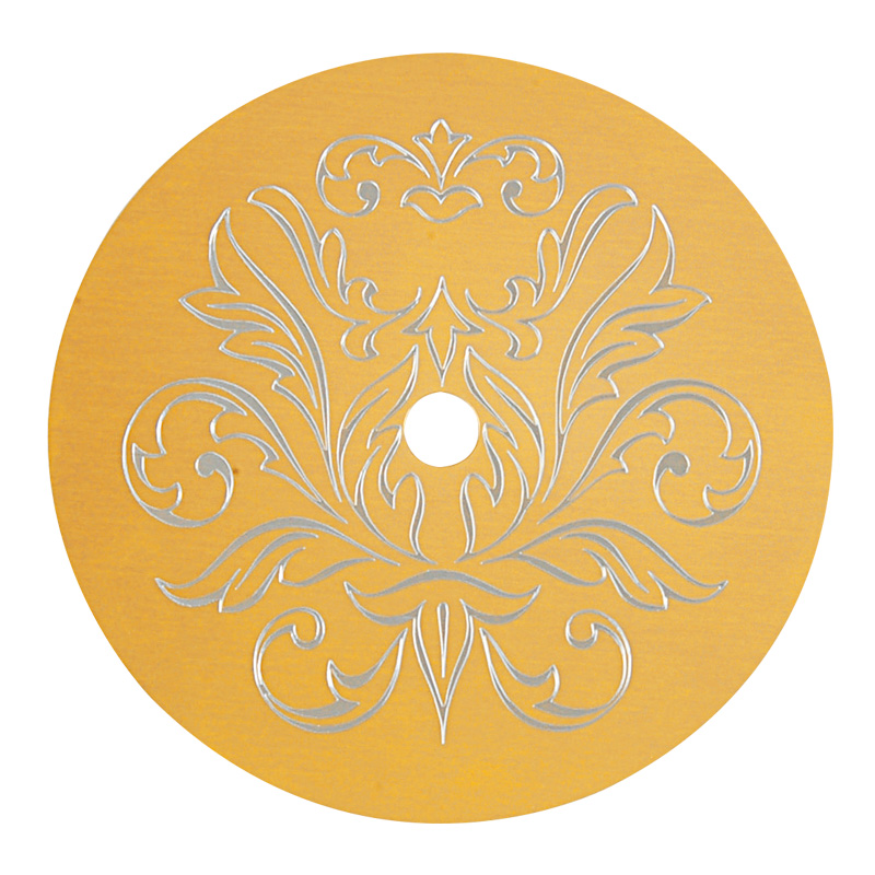 Geeignet als Zierteil oder auch zum Abdecken unbrauchbarer oder falscher Aufzugslochungen. Messingfarben eloxiertes Aluminium mit graviertem Dekor, hochglanzpoliert.