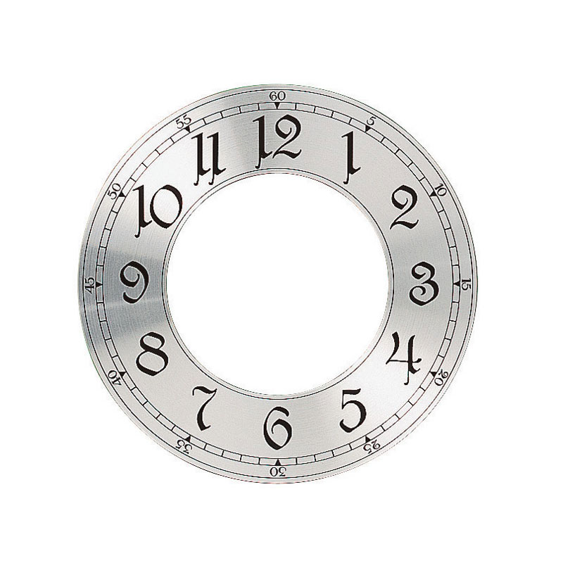 Rundgeschliffenes, silberfarbenes Aluminium mit aufgedruckten Zahlen. Außen-Ø 182,5 mm, Innen-Ø 102 mm, 0,4 mm dick. Für Zeigerlänge 75-88 mm.