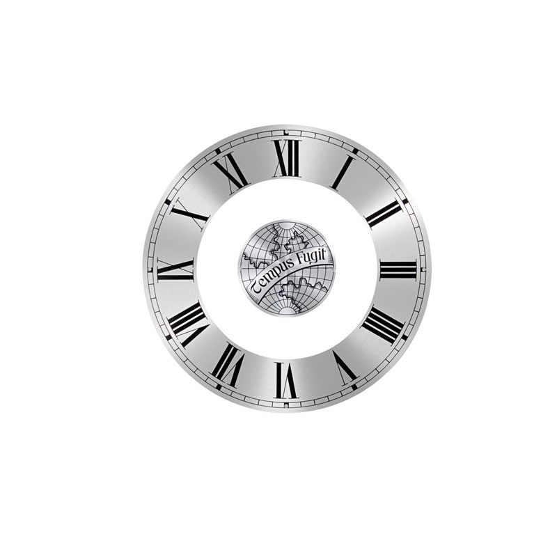 Silberfarbenes, rundgeschliffenes Aluminium, aufgedruckte Stundenmarkierungen.