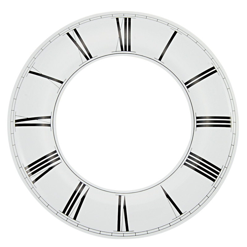 Mit aufgedruckten römischen Ziffern. Außen-Ø 190 mm, Innen-Ø 110 mm, ca. 4,5 mm hoch (leicht gewölbt). Für Zeigerlänge 80-90 mm.